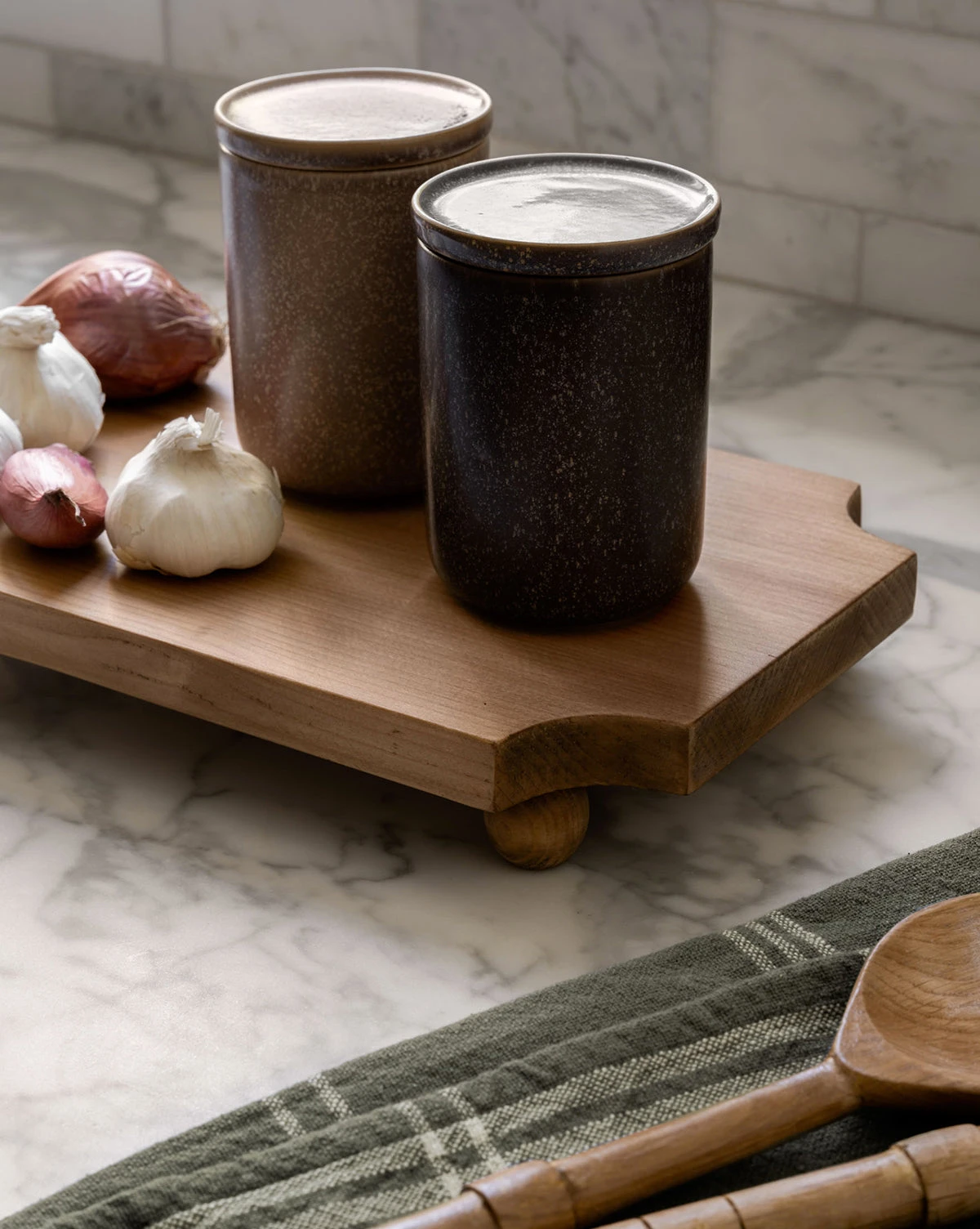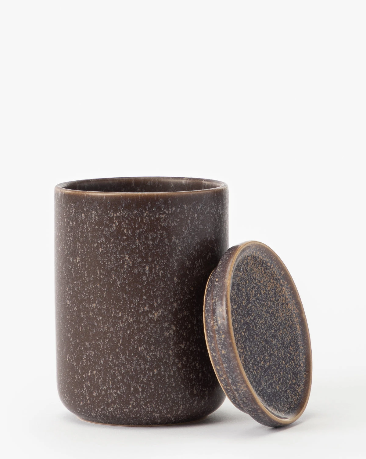 Modern design meets vintage style in the Brom Stoneware Canister. Finished with a speckled reactive glaze in either a tan or brown hue, this canister is versatile and elegant. Whether used practically in the kitchen or simply styled on shelving, the piece adds subtle interest to your space.