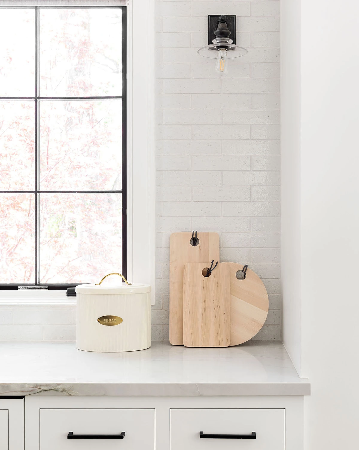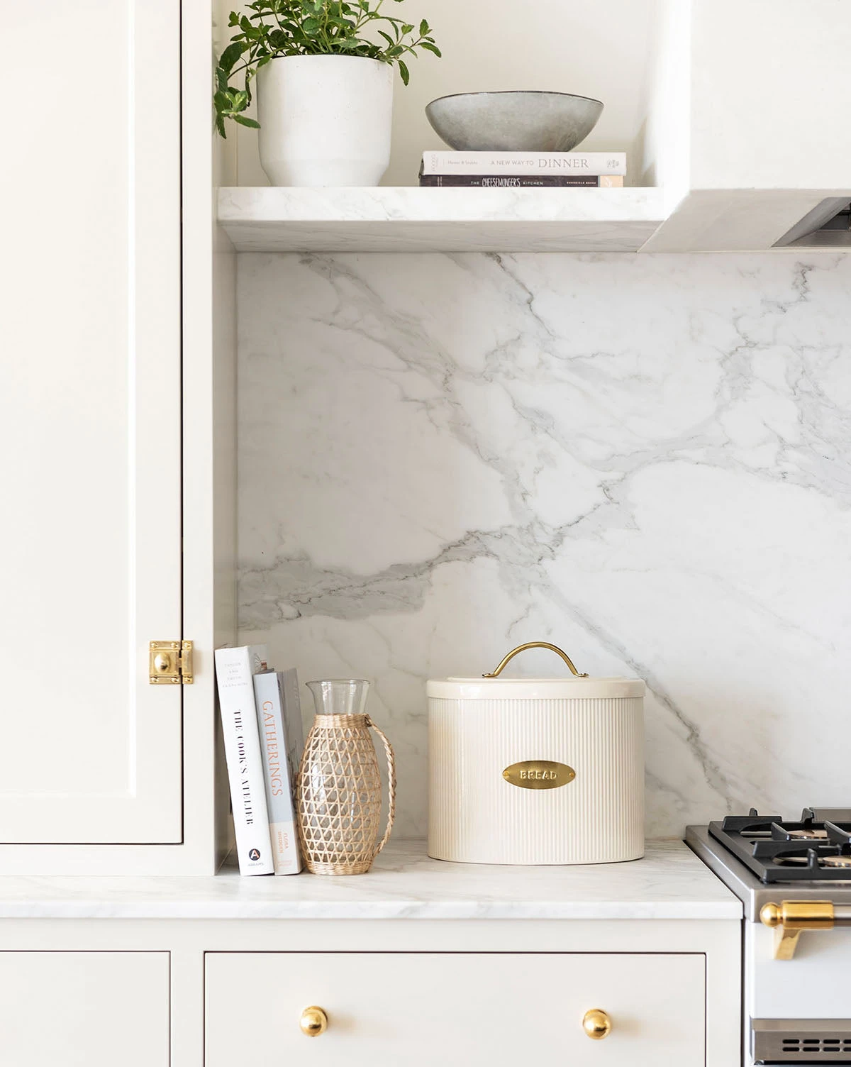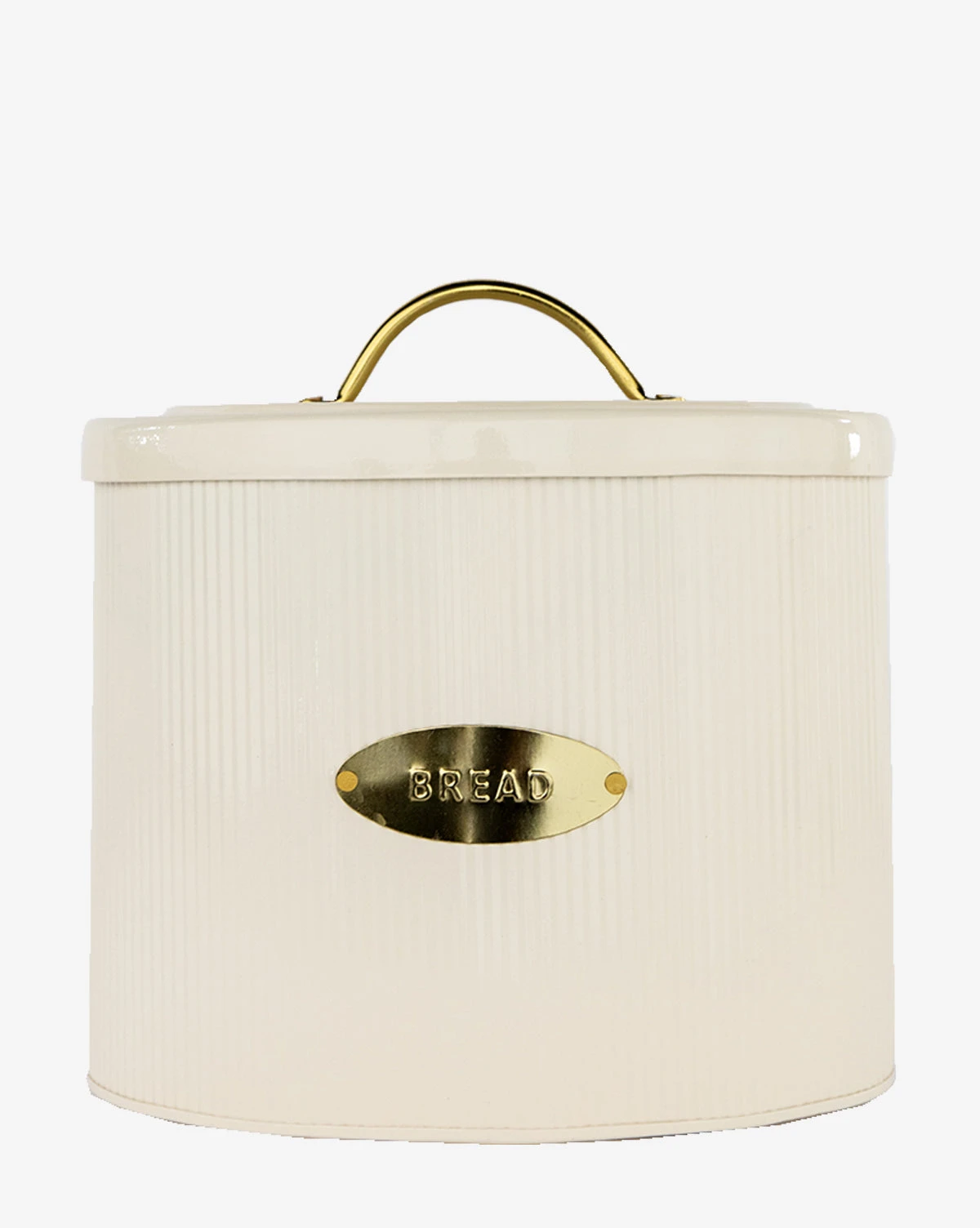 Keep your bread fresh with our Brass Detailed Metal Bread Box. An oval shape and slight ribbed detail give a delicate touch to its metal form. Finished with an oval brass “BREAD” stamp, and matching brass handle, this box looks just as good styled in your open shelving as it does filled with your favorite breads.