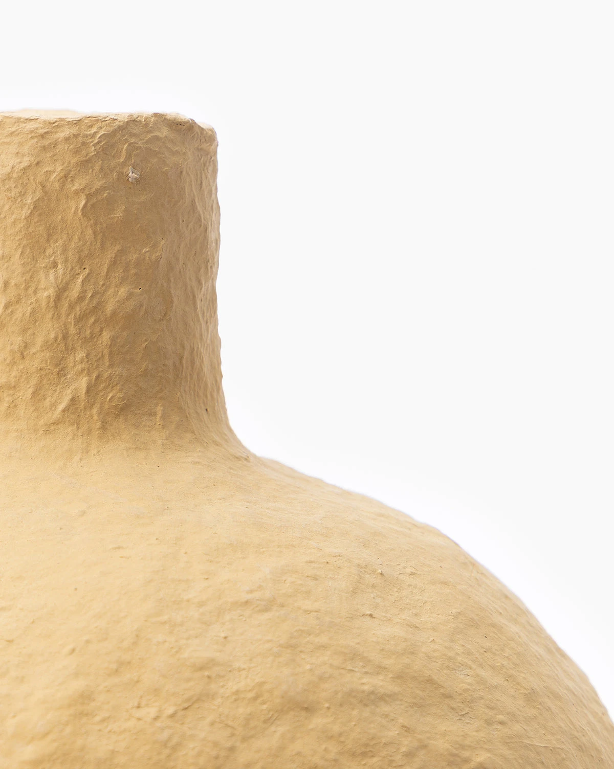 Uniquely crafted using paper mache, the hand-made Long Necked Paper Mache Vase is a wonderful detail for your home with its intriguing shape. The texture speaks to an organic feel, while the hand-crafted figure hints at a Mid-Century Modern design. With natural variation in color between each piece, the mustard tones will contribute to a neutral and calming moment wherever the vase is placed.